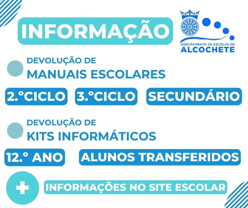 Informamos de que os KITS INFORMÁTICOS (Computadores, Hotspot e Cartão SIM) distribuídos gratuitamente, através da plataforma ESCOLA DIGITAL, devem ser devolvidos no Agrupamento de Escolas de Alcochete, de acordo com a seguinte calendarização: AQUI